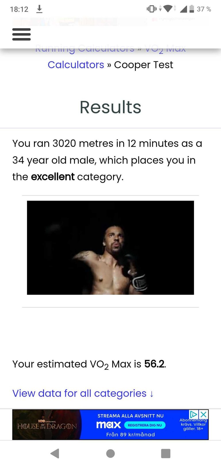 I ran 3.02km in 12mins which equals to a score of 56 and placed me on the excellent category.