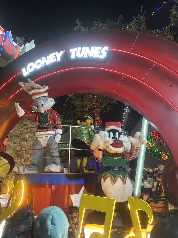 Bugs Bunny, Daffy Duck, and friends dressed for the season, waving and dancing as the float moves forward.
