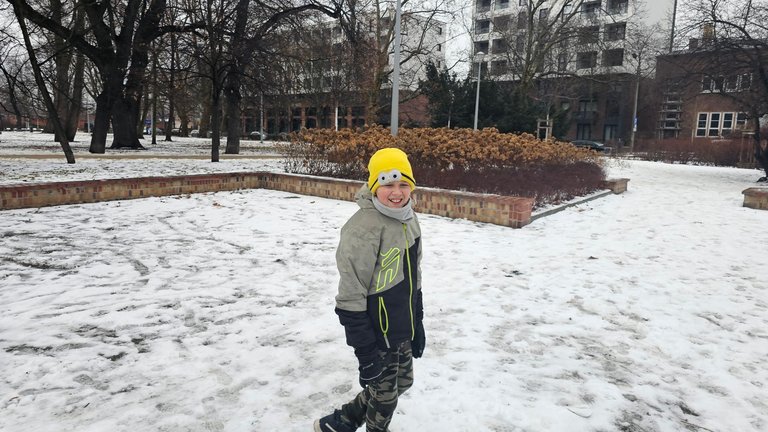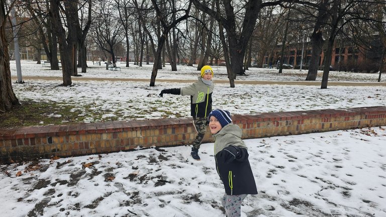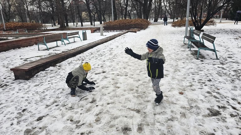 Śnieg, bieganie, śmiech, rzuty czymś co udaje śnieżkę, ślizganie się i klasyczne:
