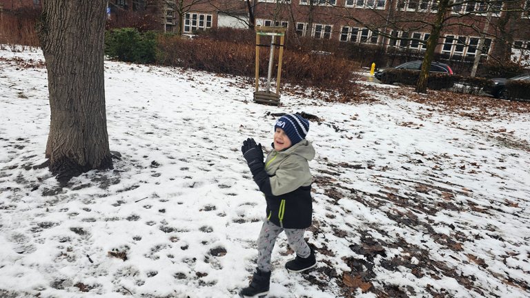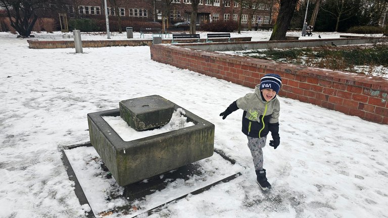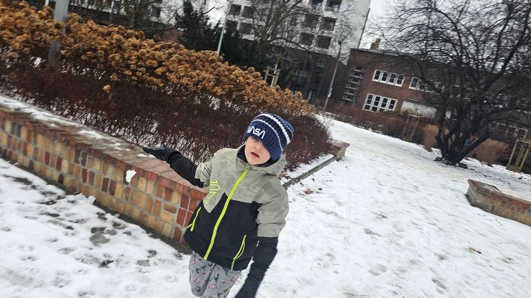 Snow, running, laughter, throwing something that pretends to be a snowball, slipping around, and the usual:
