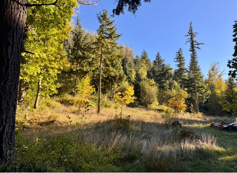 As you can see from the first photo-the skies couldn’t be any bluer and there wasn’t a cloud anywhere! There was some wind though, but it just sent all the leaves to dancing in the air and on the ground. As we came to the 90 degree curve in our road, we got hit full force with the first Nor’easter for the year. With all those 80 acres of trees gone, it sets up quite the wind tunnel-a precursor to the winter to come! 🥶
