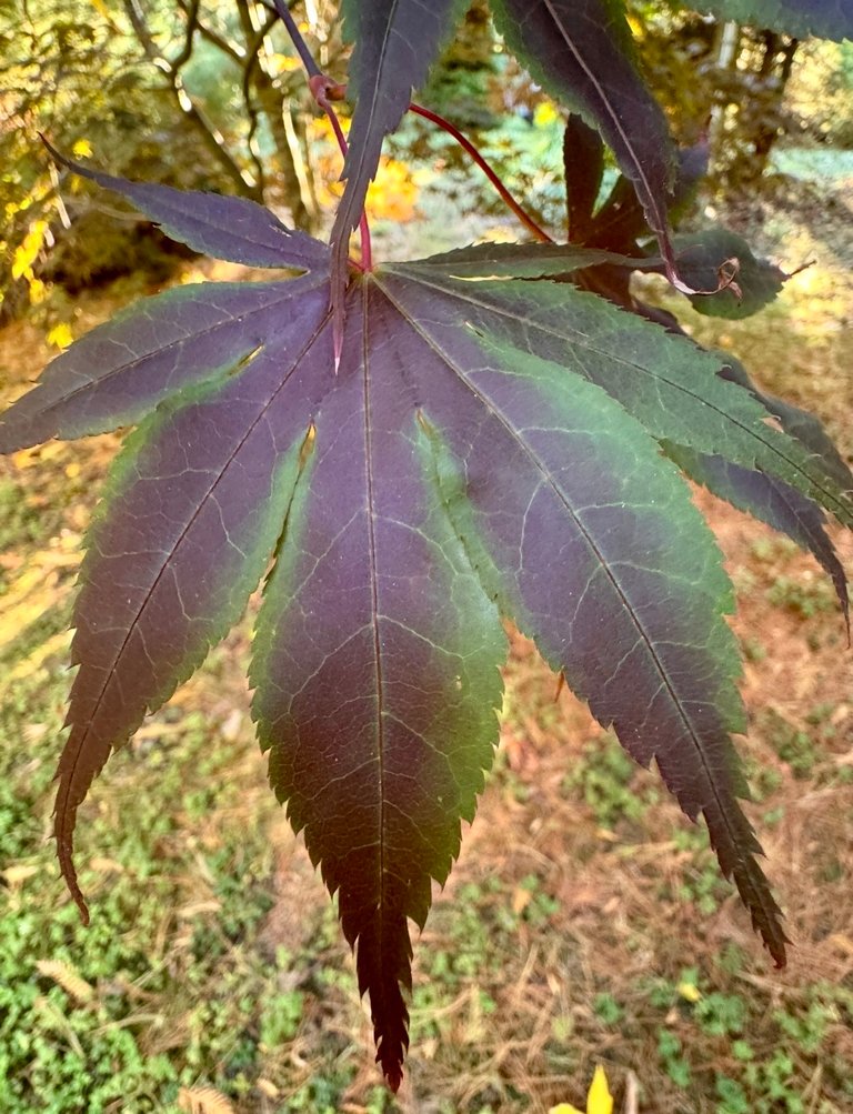 The blood good Japanese maple has not gotten its crimson leaves for fall just yet. With the sun shining through them, you might think so…….