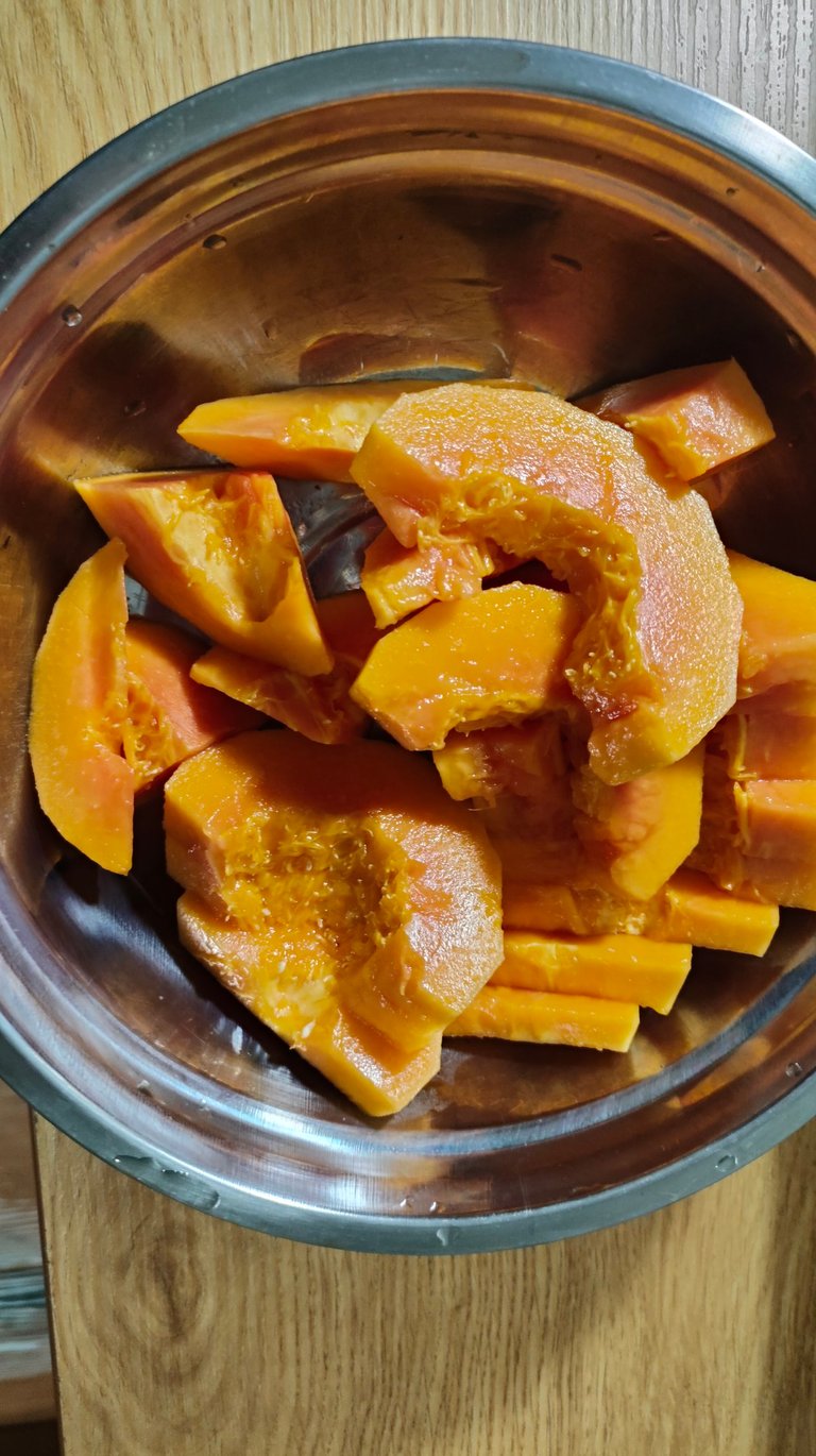 如果不是自己亲自买的,谁能看出来这是煮熟的南瓜还是木瓜呢!切开之后也太像了吧!上一次吃木瓜还是在埃塞俄比亚的时候,那时候的木瓜可真便宜啊!怀念那段时光!