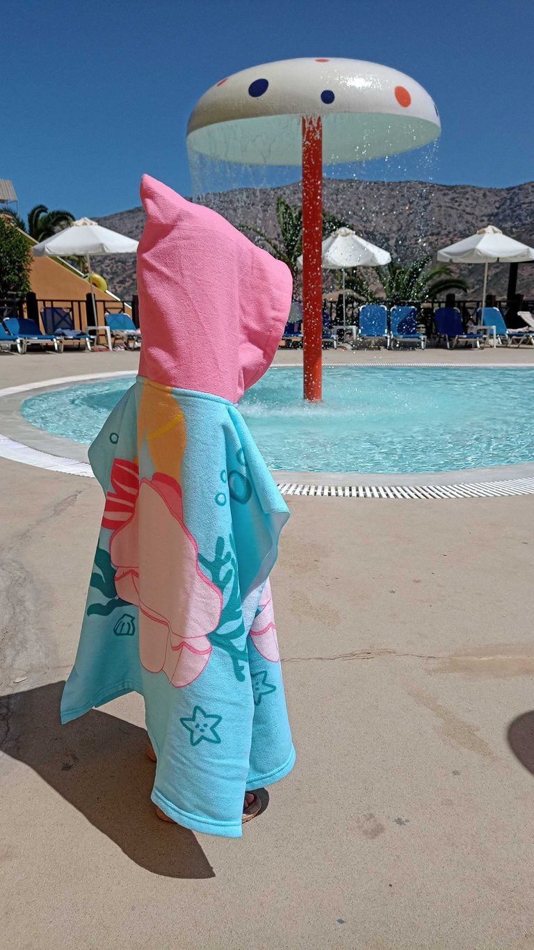 Na obrázku je Terezka sušící se po vodních radovánkách.