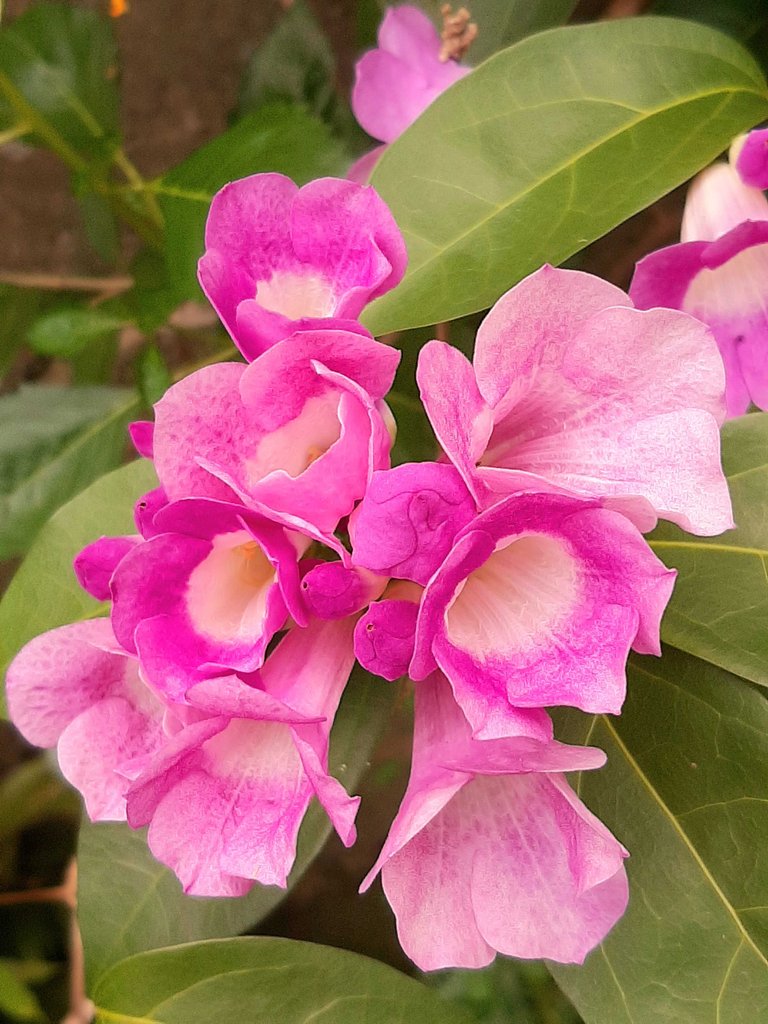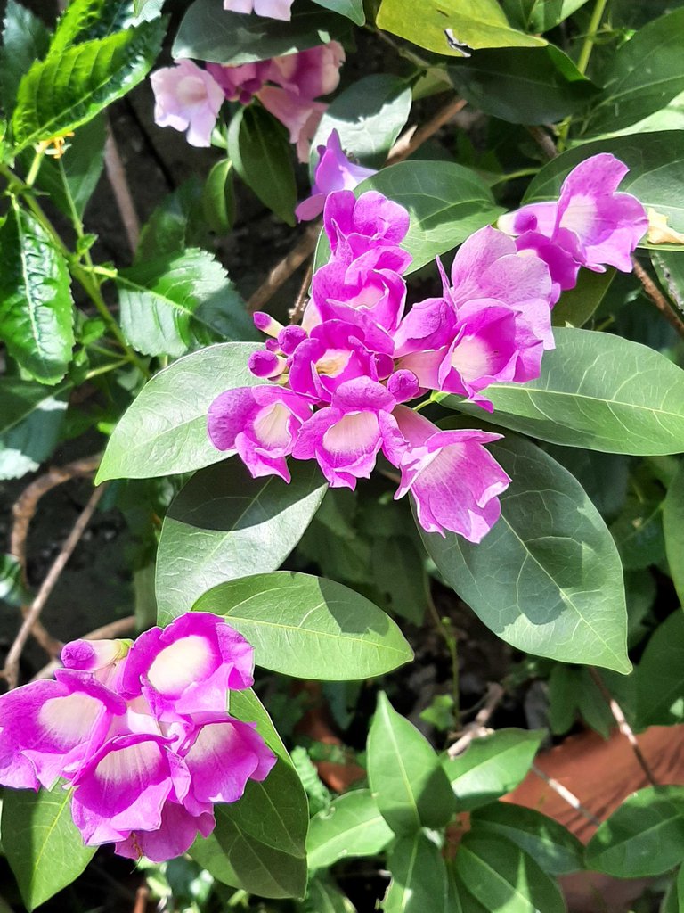 These garlic vine flower bloom are blooming at the same time. See how pretty they are...💜💗💕 and a lone white rain lily. 🤍💚