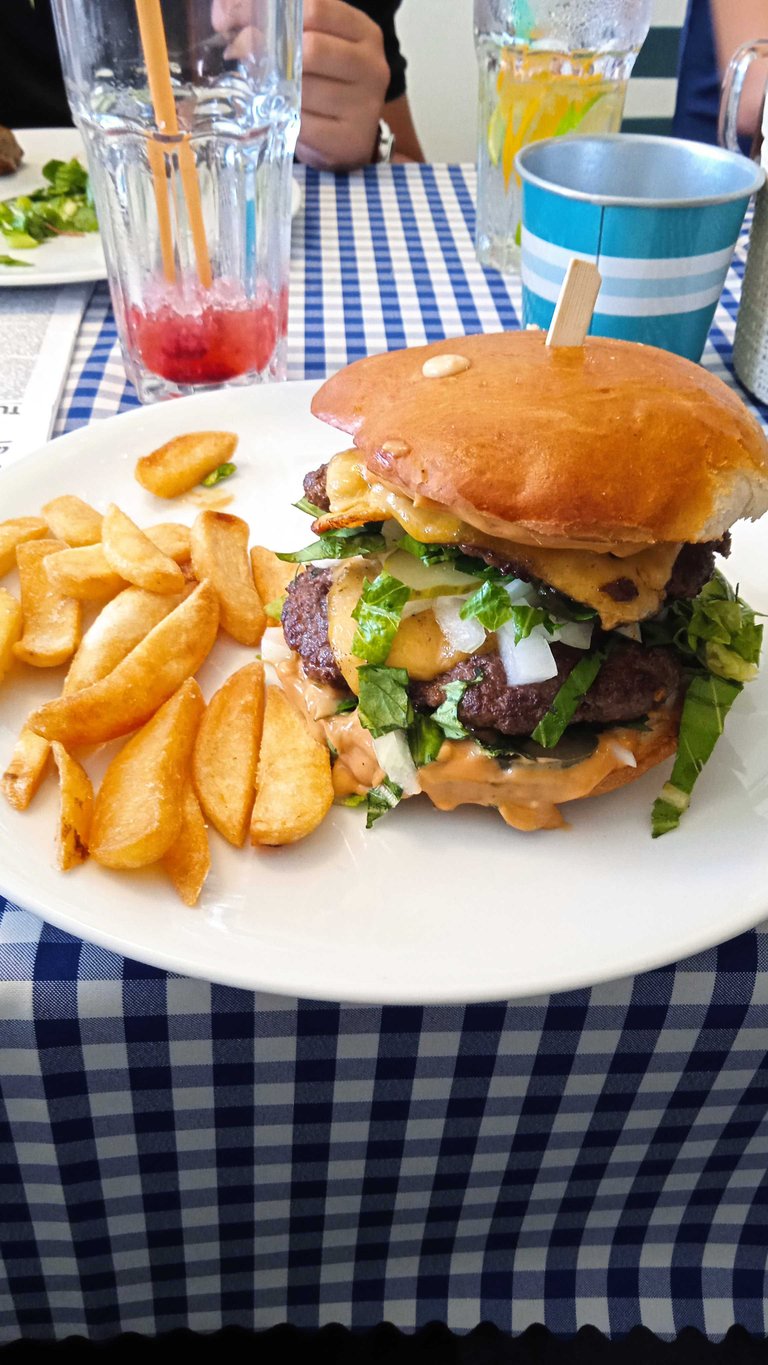 Po dvou hodinách čekáni na jídlo jsem dostal svůj Burger s dvojitým masem. Poradil jsem si snim.