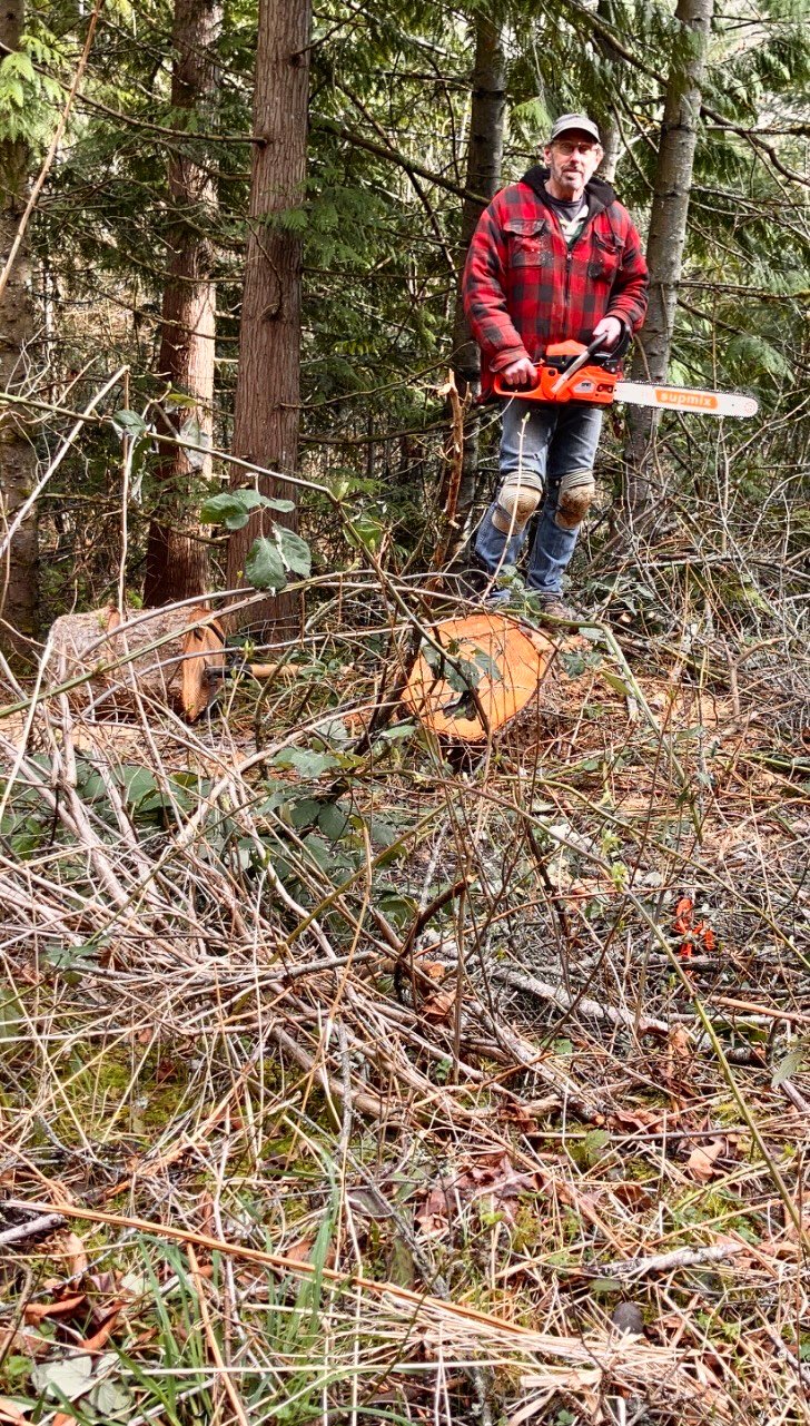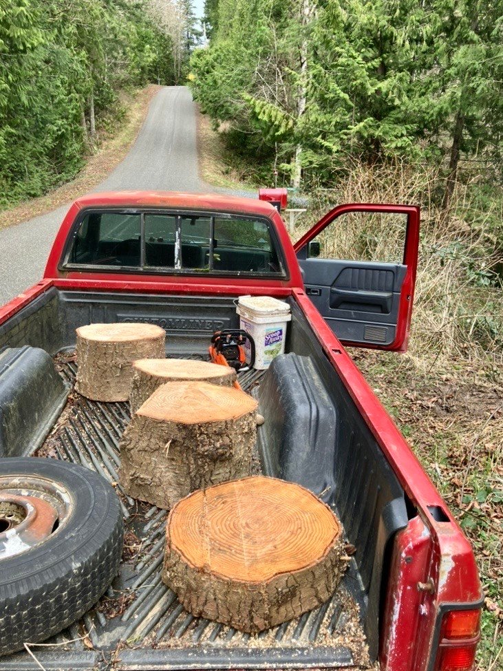 Silvertop stopped the chainsaw after each cut, and struggled uphill through mud and Blackberries, carrying each extremely heavy round to his truck!😅