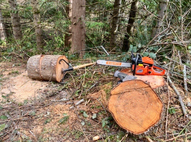 Today….. with no Snow, and no rain in sight, Silvertop pulled the starter rope on his chainsaw, and began cutting………………